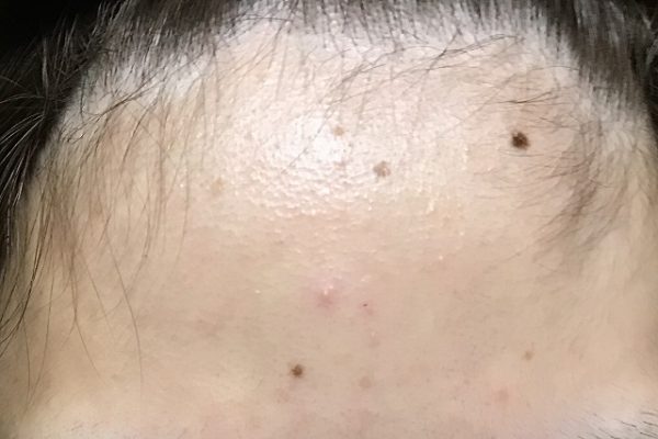 こちらはトライアルセットを使い始めた1日目で、おでこ全体に赤い小さなプツプツニキビができています。