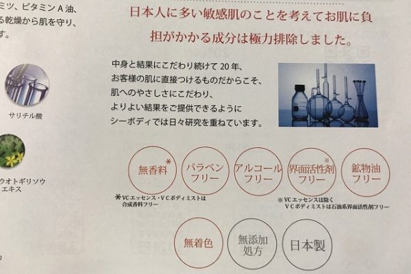 VCスターターセットは香料や着色料、パラベンにアルコール、鉱物油、界面活性剤などを一切含んでいないので、敏感肌でも安心して使えそうです。