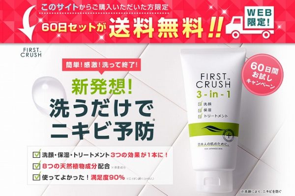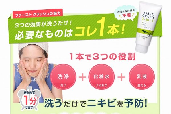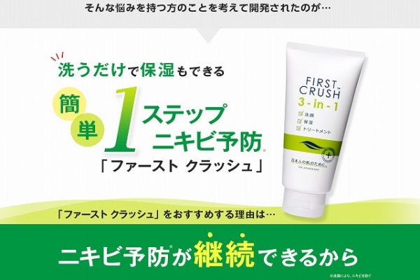 ファーストクラッシュは洗顔料ですが、顔だけでなく背中や身体にも使える優れたニキビスキンケアで、これ一つでニキビケアが完了できるので、経済的にもとても魅力的といえます。